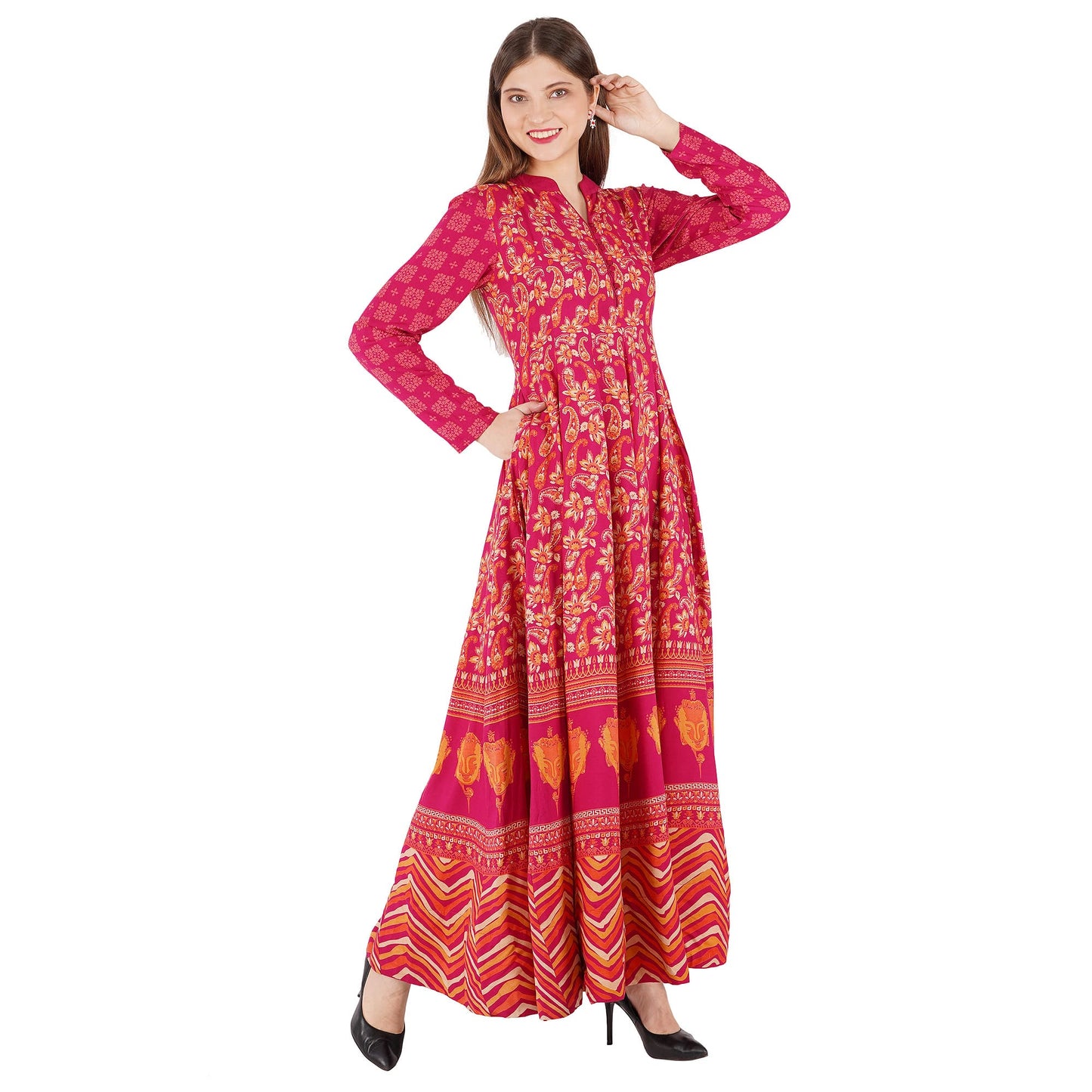 Make use of this stunning rayon-printed Anarkali kurta with a pocket that is pink in color for upgrading your fashion statement in the best possible manner. Featuring a 3/4TH sleeve, this dress can be noticed by everybody and will bring you plenty of compliments as well.