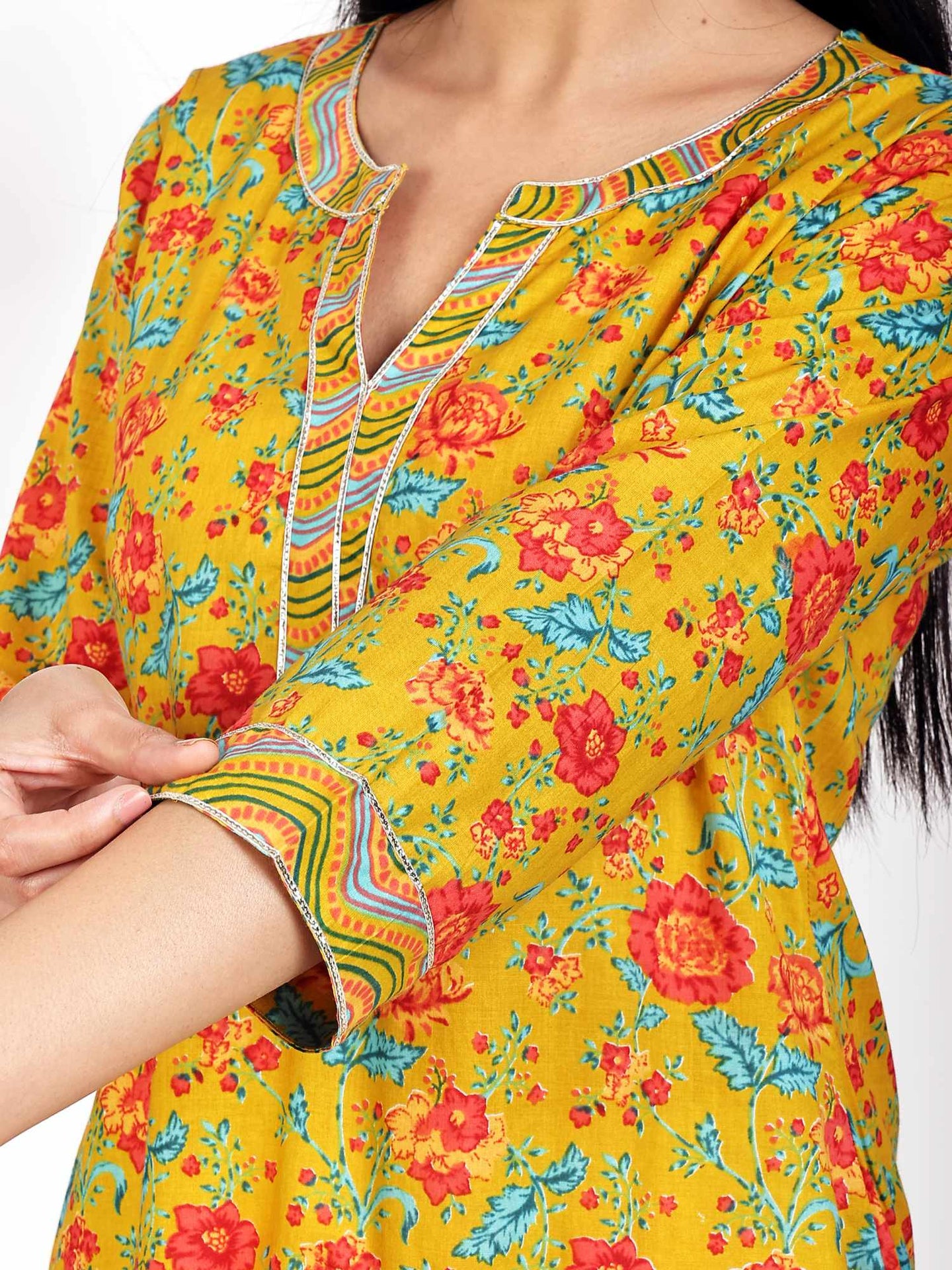Brighten up your wardrobe with this vibrant yellow floral printed straight kurta, crafted from 100% pure cotton for all-day comfort and breathability. Designed with a flattering Round V-neckline and classic straight silhouette, this kurta combines traditional charm with everyday ease. Whether it's a casual brunch, workday, or festive get-together, this piece adds effortless elegance to any occasion.